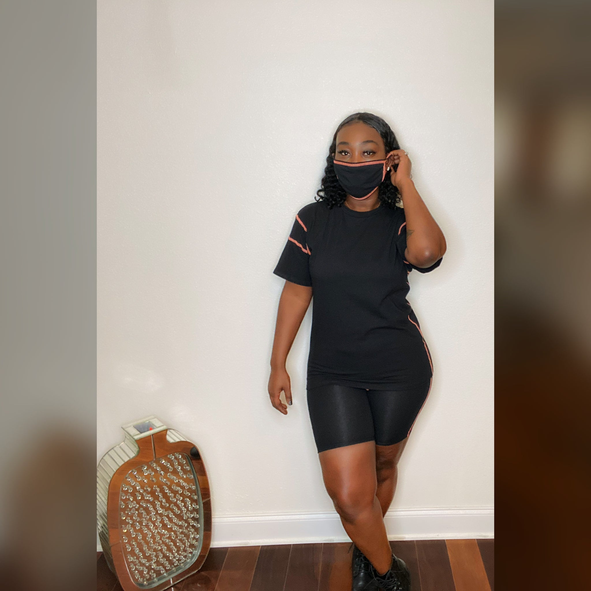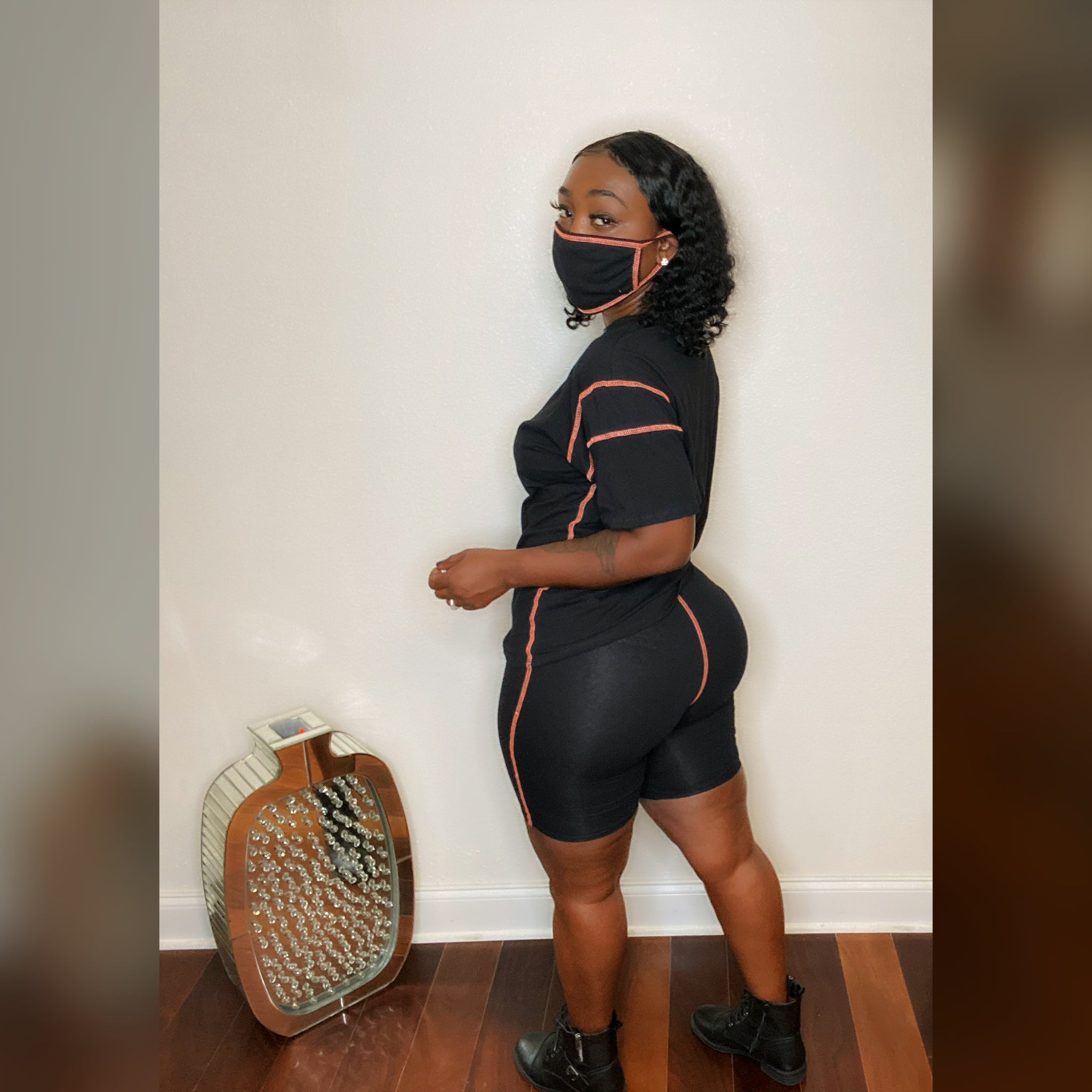 Comfortable shirt and short set with matching mask. Be stylish without even trying!
